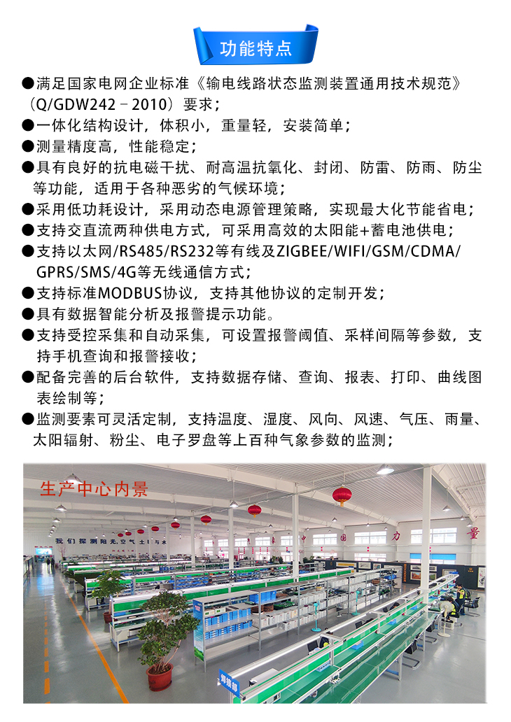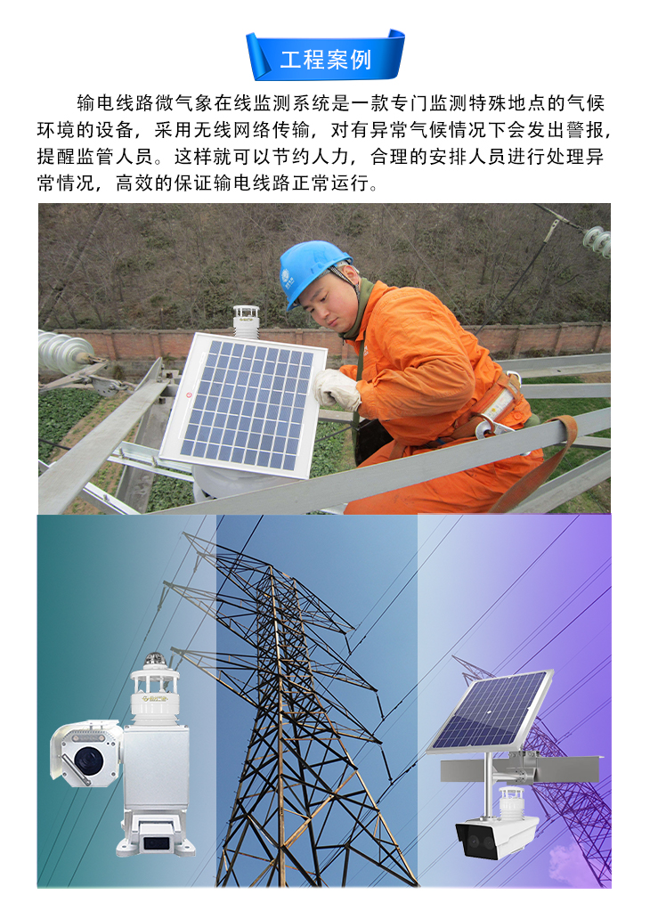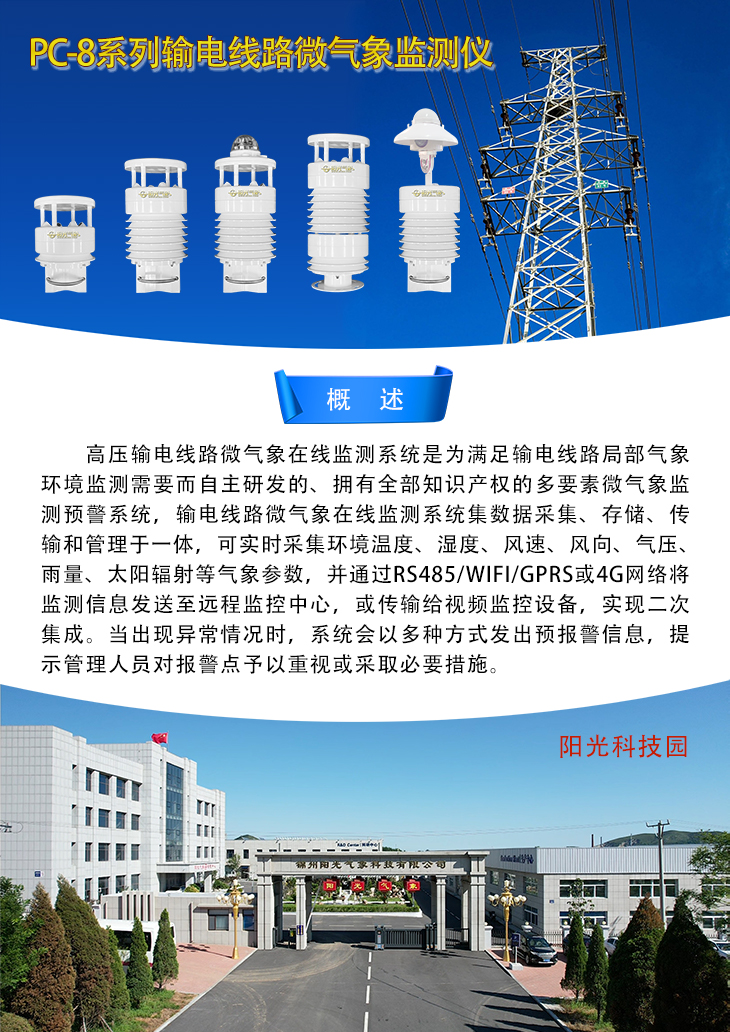 高壓輸電線路微氣象在線監(jiān)測系統(tǒng)是為滿足輸電線路局部氣象環(huán)境監(jiān)測需要而自主研發(fā)的、擁有全部知識(shí)產(chǎn)權(quán)的多要素微氣象監(jiān)測預(yù)警系統(tǒng),輸電線路微氣象在線監(jiān)測系統(tǒng)集數(shù)據(jù)采集、存儲(chǔ)、傳輸和管理于一體,可實(shí)時(shí)采集環(huán)境溫度、濕度、風(fēng)速、風(fēng)向、氣壓、雨量、太陽輻射等氣象參數(shù),并通過RS485/WiFi/GPRS或4G網(wǎng)絡(luò)將監(jiān)測信息發(fā)送至遠(yuǎn)程監(jiān)控中心,或傳輸給視頻監(jiān)控設(shè)備,實(shí)現(xiàn)二次集成。當(dāng)出現(xiàn)異常情況時(shí),系統(tǒng)會(huì)以多種方式發(fā)出預(yù)報(bào)警信息,提示管理人員對(duì)報(bào)警點(diǎn)予以重視或采取必要措施。