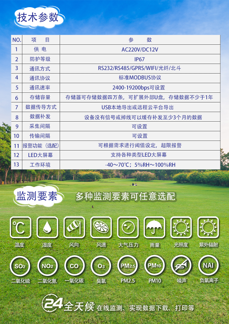 TRM-ZS5A型景區(qū)氣象站,又稱為景區(qū)氣象監(jiān)測(cè)站,是專門針對(duì)景區(qū)氣象環(huán)境特點(diǎn)而研發(fā)和設(shè)計(jì)的一款自動(dòng)化的氣象設(shè)備,外形美觀、安裝簡(jiǎn)單,可以根據(jù)不同地區(qū)的氣候特性選擇不同的監(jiān)測(cè)要素,支持多種傳輸方式,系統(tǒng)由一體化氣象站和彩色LED大屏幕組成,系統(tǒng)可將采集的數(shù)據(jù)實(shí)時(shí)顯示在大屏幕上,也可以通過(guò)GPRS/WIFI網(wǎng)絡(luò)傳輸至云平臺(tái)供客戶下載查看。